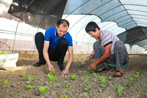 马涛正和贫困户赵大娘一起交流生菜种植技巧