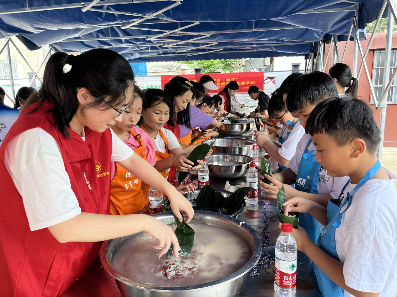 粽叶飘香迎端午。“小朋友们,大家知道端午节的习俗有什么?”“我知道!赛龙舟、吃粽子、挂艾草........”志愿者通过生动有趣的讲述和互动提问,向孩子们讲述了端午节的由来。接着志愿者向孩子们分享包粽子的技巧,让孩子们体验包粽子的过程,大家洗粽叶、剪绳子、淘糯米、包粽子,分工有序,配合默契,其乐融融,忙得不亦乐乎。不一会儿,一个个棱角不规范却有模有样的粽子展现在大家面前,孩子们在亲身参与中学习了端午文化知识、感受了端午文化魅力。